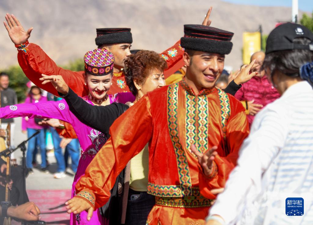 在新疆塔什庫爾干塔吉克自治縣帕米爾旅游區游客服務(wù)中心,縣文工團演員與游客共舞(9月4日攝)。