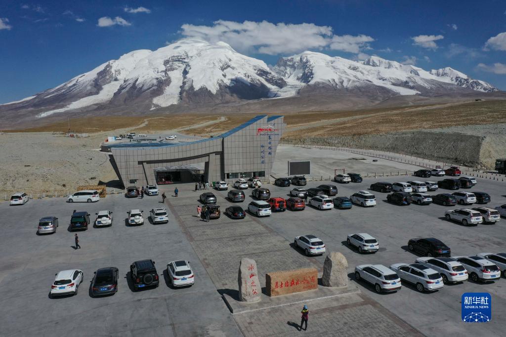 自駕游客的車(chē)輛??吭谛陆矌鞝柛伤俗灾慰h慕士塔格冰川公園門(mén)前(9月1日攝,無(wú)人機照片)。