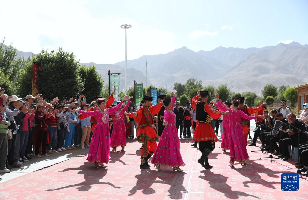 在新疆塔什庫爾干塔吉克自治縣帕米爾旅游區游客服務(wù)中心,縣文工團演員跳舞歡迎游客(9月4日攝)。