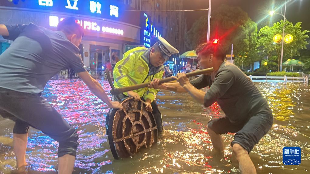9月5日晚,因路面積水嚴重,福州市連江縣公安局民警與群眾抬起井蓋,疏通下水道。