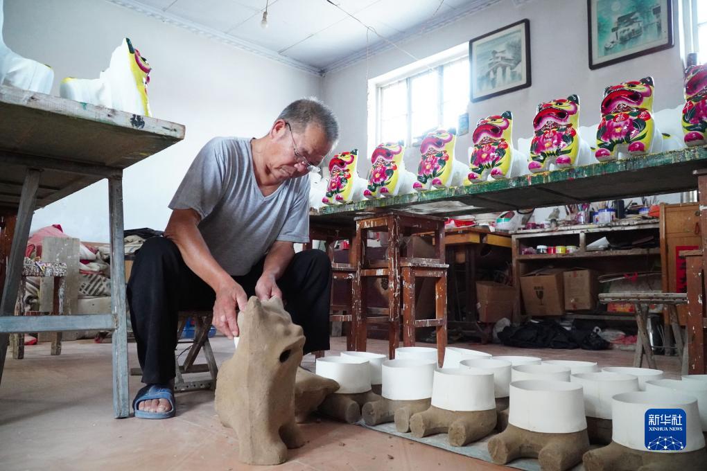 9月5日,在山東省高密市姜莊鎮的一處非遺工坊,村民聶祥之在制作泥老虎產(chǎn)品。