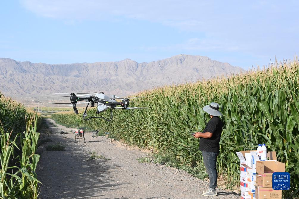 9月5日,在山丹縣位奇鎮十里堡村,技術(shù)人員開(kāi)展“一噴多促”作業(yè)。