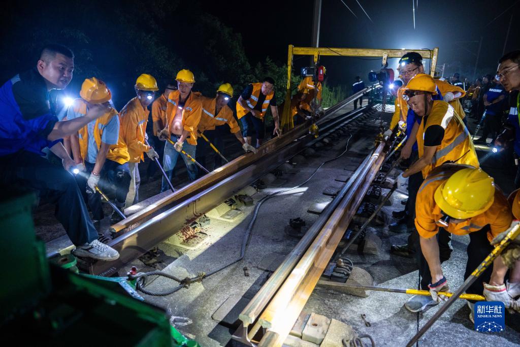 9月6日凌晨,鐵路工人在京廣高鐵株洲西至衡山西區間進(jìn)行換軌施工。