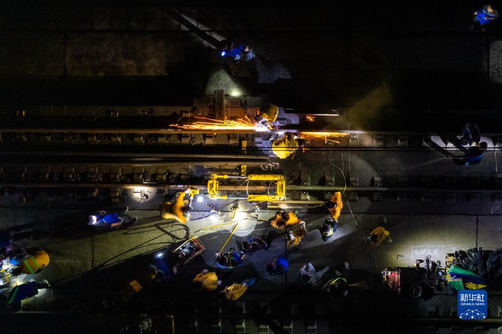 9月6日凌晨,鐵路工人在京廣高鐵株洲西至衡山西區間進(jìn)行換軌施工(無(wú)人機照片)。