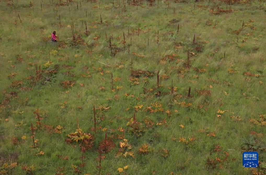 9月5日,中國科學(xué)院西北高原生物研究所副研究員楊路存在果洛藏族自治州甘德縣崗龍鄉一處“草藥間種”的黑土灘治理試驗田中查看植被生長(cháng)情況(無(wú)人機照片)。