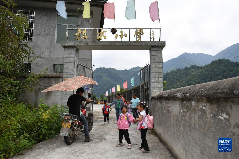 9月4日,在湖南新化縣奉家鎮報木小學(xué),家長(cháng)接孩子們放學(xué)。