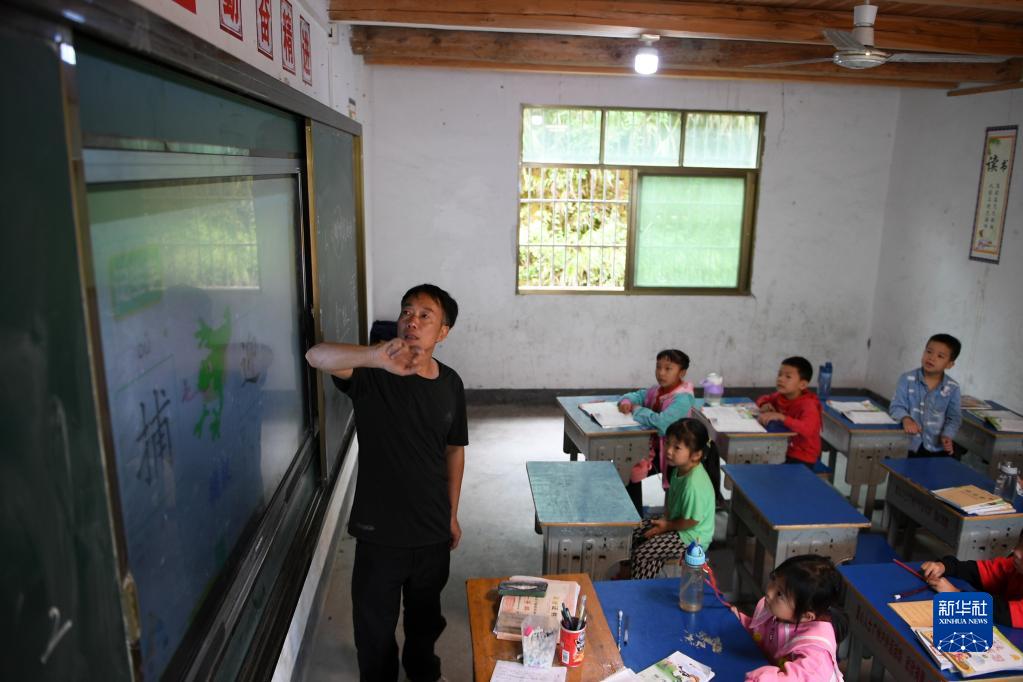9月4日,報木小學(xué)校長(cháng)段同山在給二年級和學(xué)前班的學(xué)生們上課。