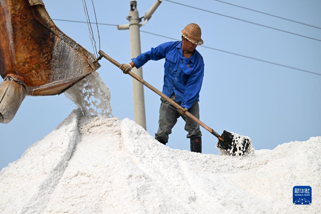 9月6日,天津長(cháng)蘆漢沽鹽場(chǎng)工人在整理鹽坨。