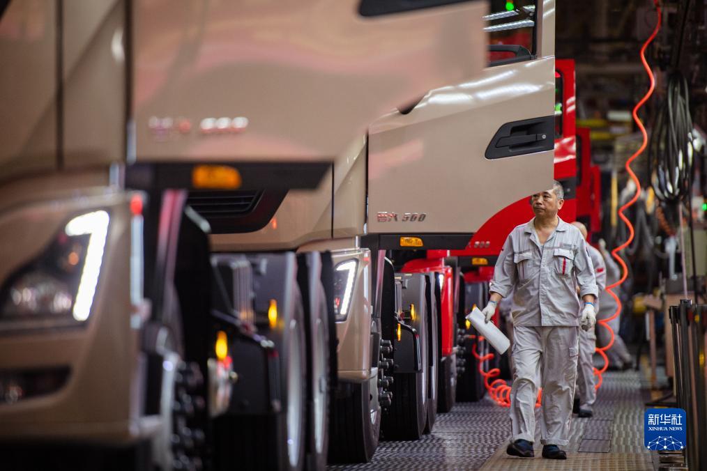 9月6日,在東風(fēng)商用車(chē)有限公司車(chē)輛工廠(chǎng),工人準備接車(chē)下線(xiàn)。