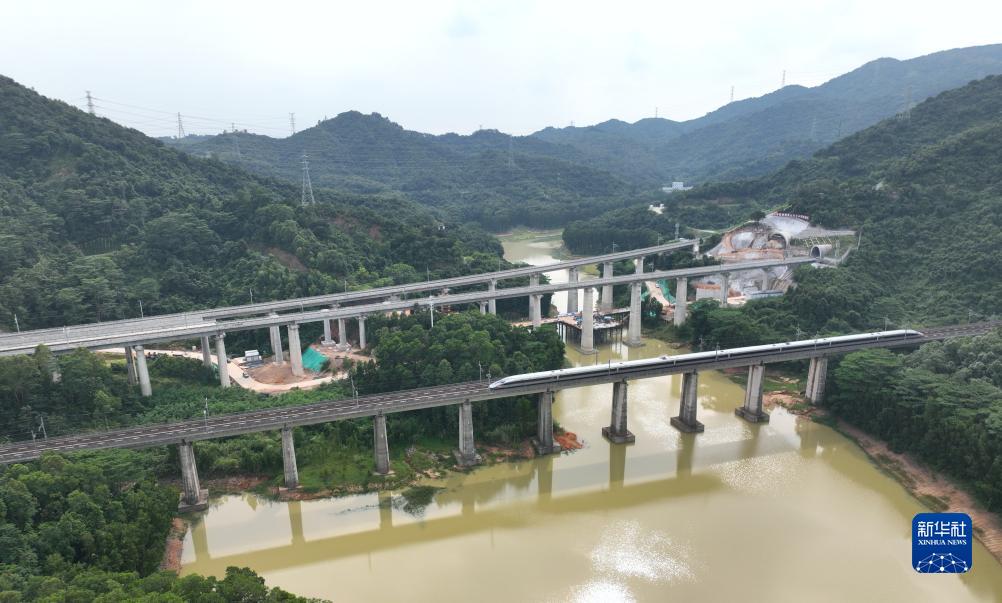 9月6日,廣深港鐵路列車(chē)從在建的深江鐵路深圳段陽(yáng)臺山隧道旁駛過(guò)(無(wú)人機照片)。
