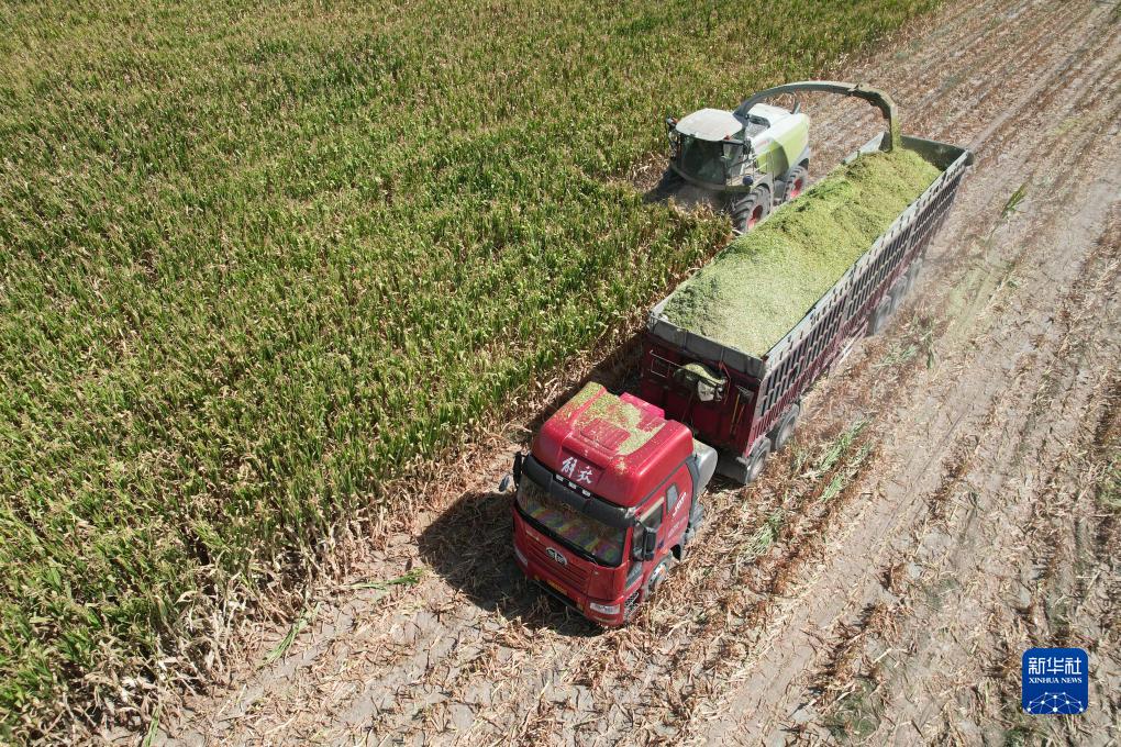 9月6日,在金昌市永昌縣六壩鎮八壩村,工作人員使用大型機械收獲青貯玉米(無(wú)人機照片)。
