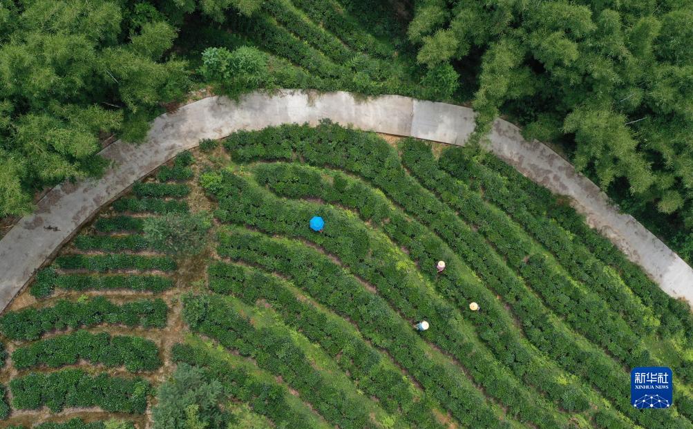 在梧州市蒼梧縣六堡鎮塘坪村,茶農在茶園里采茶(無(wú)人機照片,9月6日攝)。