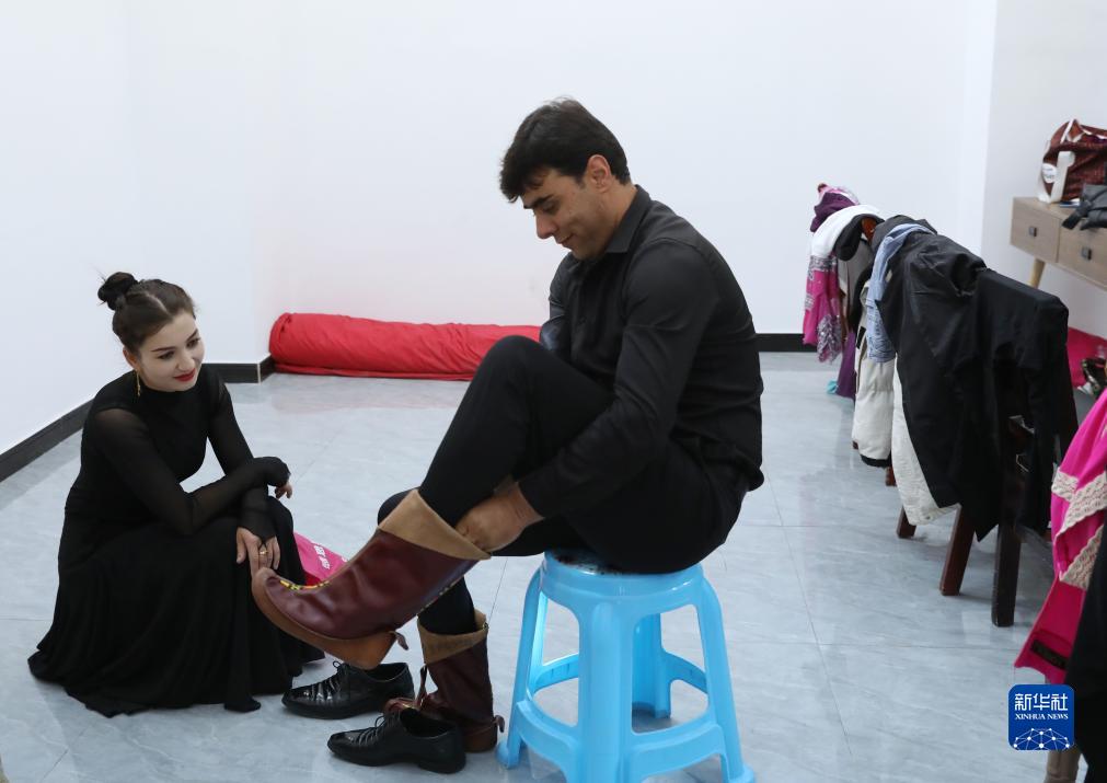 古麗巴努爾·庫爾恰克在排練前幫丈夫試穿演出時(shí)要穿的靴子(9月4日攝)。