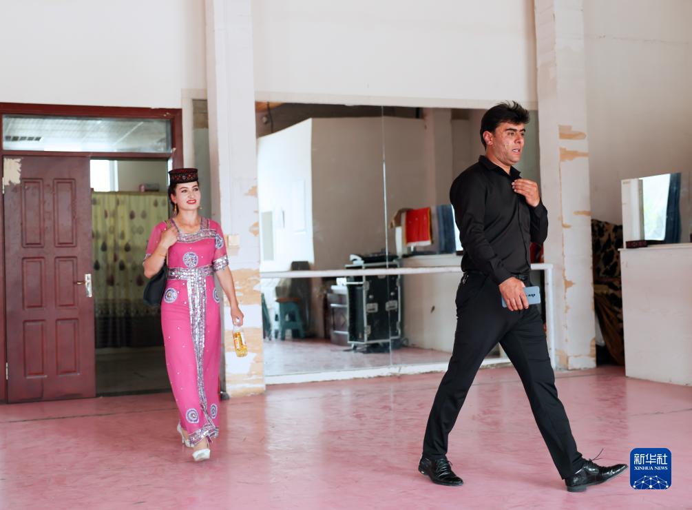 完成迎賓演出后,拜合提亞爾·居馬汗和妻子離開(kāi)游客服務(wù)中心,準備前往學(xué)校接孩子回家(9月4日攝)。