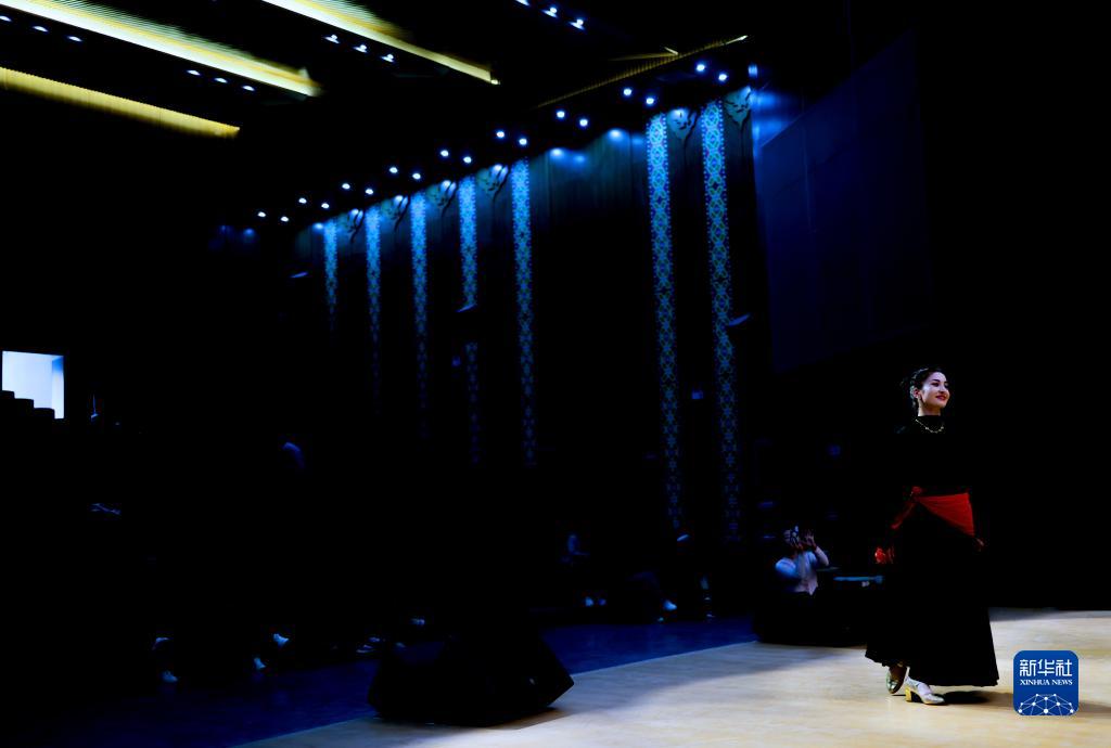 古麗巴努爾·庫爾恰克在文化服務(wù)中心劇場(chǎng)排練舞蹈節目《花兒為什么這樣紅》(9月4日攝)。