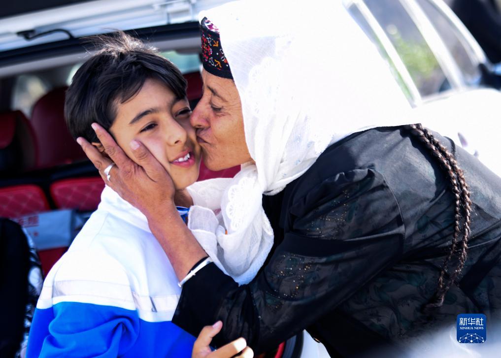 拜合提亞爾·居馬汗的母親親吻剛剛放學(xué)回家的孫子木拉夏提(9月4日攝)。