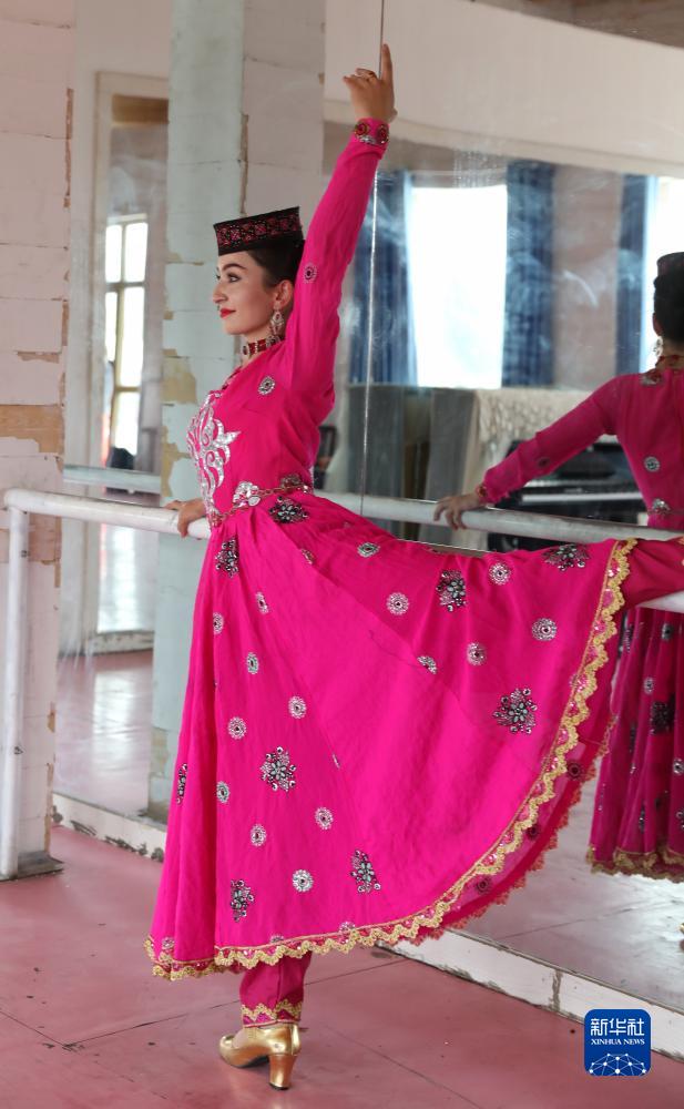 在新疆塔縣帕米爾旅游區游客服務(wù)中心,古麗巴努爾·庫爾恰克在排練室活動(dòng)身體,準備當天下午的迎賓演出(9月4日攝)。