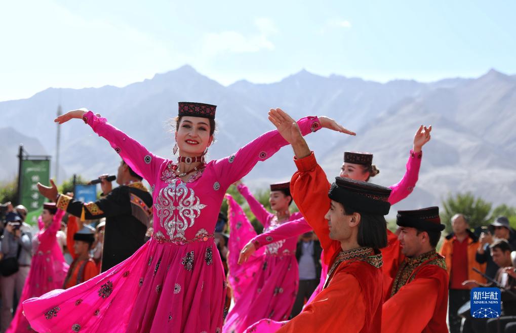 古麗巴努爾·庫爾恰克和同事們一起為遠道而來(lái)的游客起舞,展示當地特色迎賓儀式(9月4日攝)。