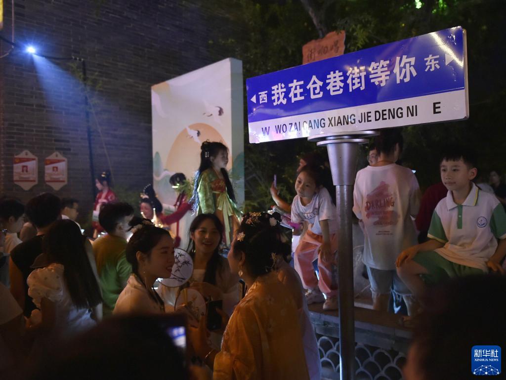 9月7日晚在安陽(yáng)古城倉巷街拍攝的“古韻鎏光·燈火安陽(yáng)”沉浸式夜游活動(dòng)現場(chǎng)。