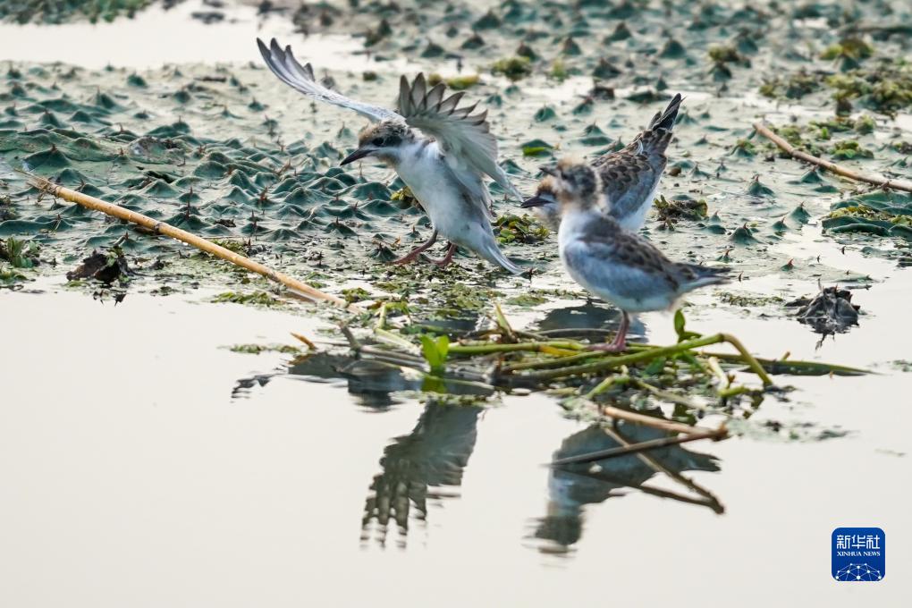 須浮鷗幼鳥(niǎo)在江蘇省鹽城市建湖縣九龍口國家濕地公園內嬉戲(9月7日攝)。