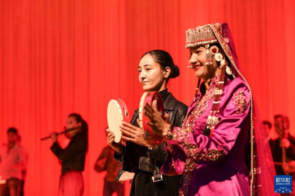 新疆塔縣文工團樂(lè )手在排練節目《絲路遺夢(mèng)》時(shí)演奏鈴鼓(9月7日攝)。新華社記者 胡虎虎 攝