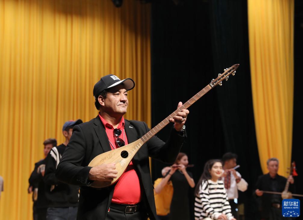 新疆塔縣文工團樂(lè )手熱合曼·買(mǎi)買(mǎi)提阿不扎力在排練時(shí)彈奏夏西塔爾(一種六弦琴樂(lè )器)(9月4日攝)。新華社記者 程婷婷 攝