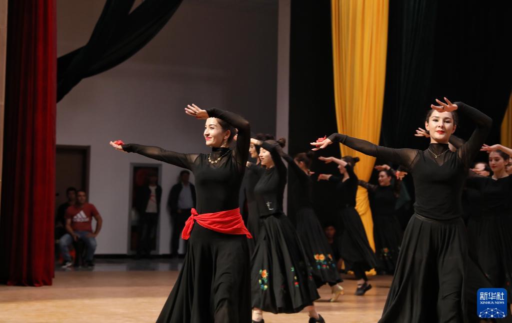 新疆塔縣文工團舞蹈演員古麗巴努爾·庫爾恰克(前左)和同伴們在排練節目《花兒為什么這樣紅》(9月4日攝)。新華社記者 程婷婷 攝