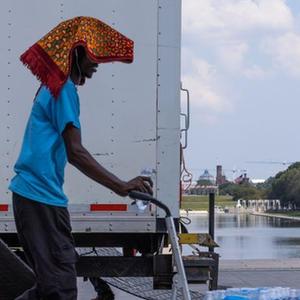 9月7日,在美國首都華盛頓,一名男子喝水抵御高溫天氣。