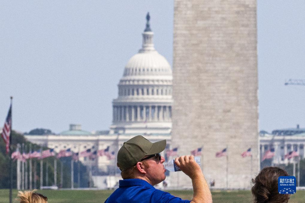 9月7日,在美國首都華盛頓,一名男子喝水抵御高溫天氣。
