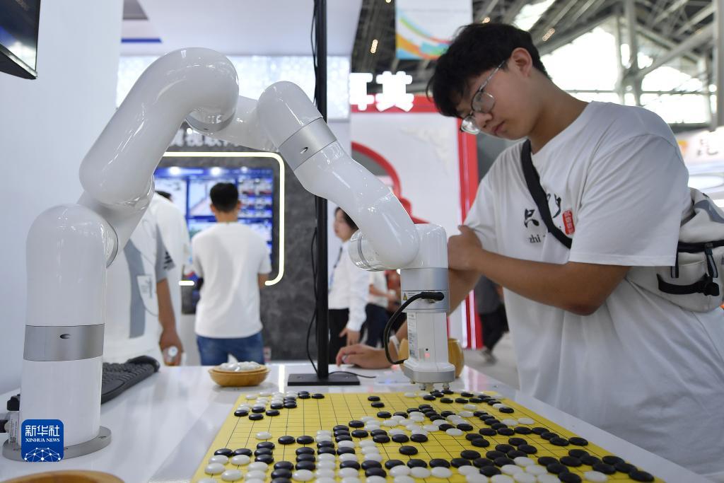9月6日,參觀(guān)者在數博會(huì )上與5G智能機器人下圍棋。