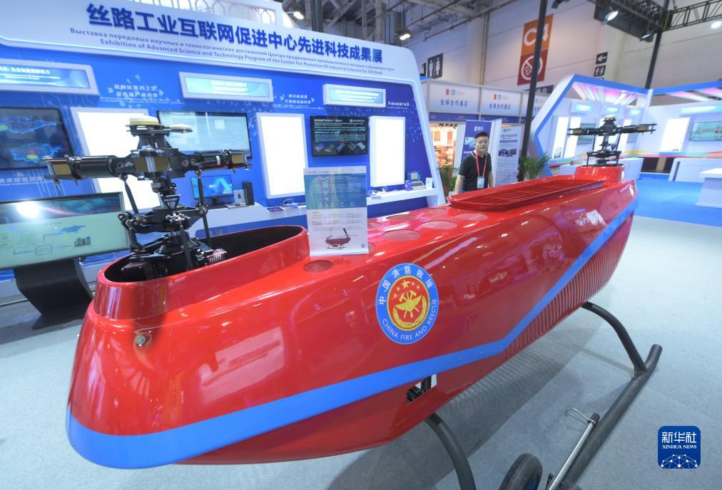 9月8日拍攝的在中國—中亞國家合作展區展出的縱列式雙旋翼無(wú)人直升機。