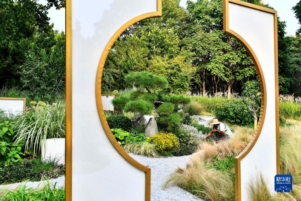 9月7日,在德州市行政中心綠地花園,園林工作人員在養護作業(yè)。