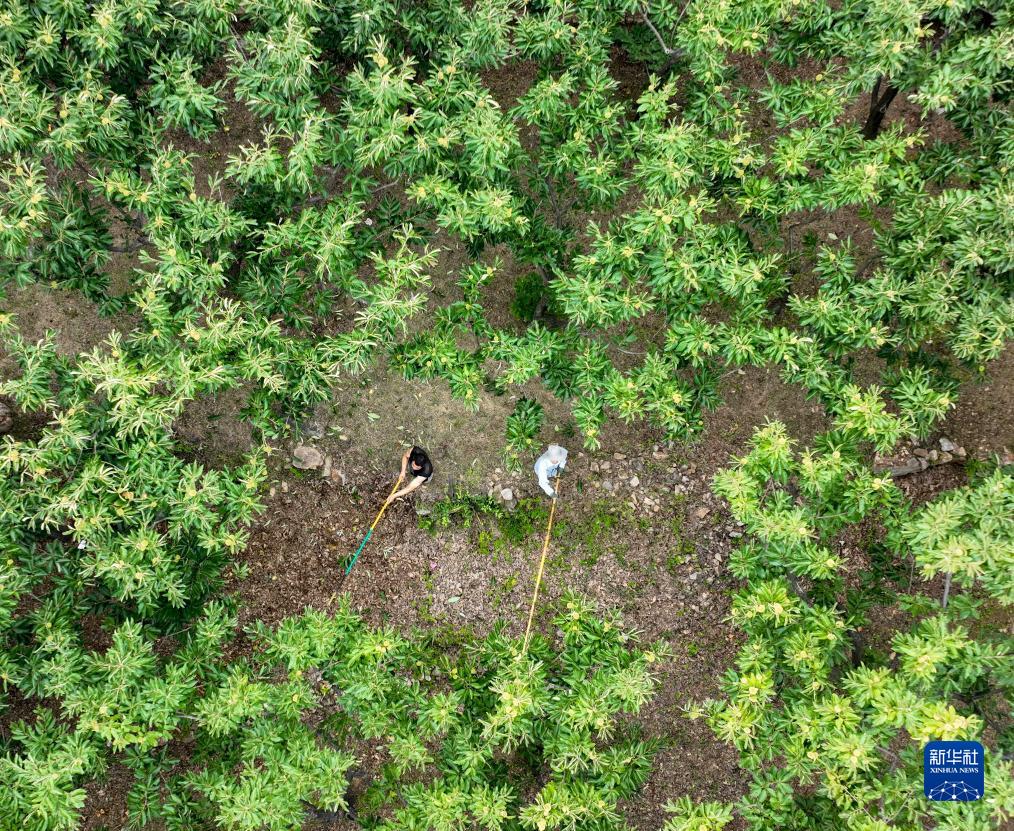 9月8日,在寬城縣碾子峪鎮艾峪口村,農民在收獲板栗(無(wú)人機照片)。