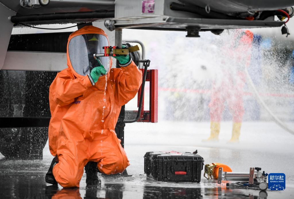 9月8日,參賽隊員在參加危險化學(xué)品運輸槽車(chē)泄漏處置項目比賽。