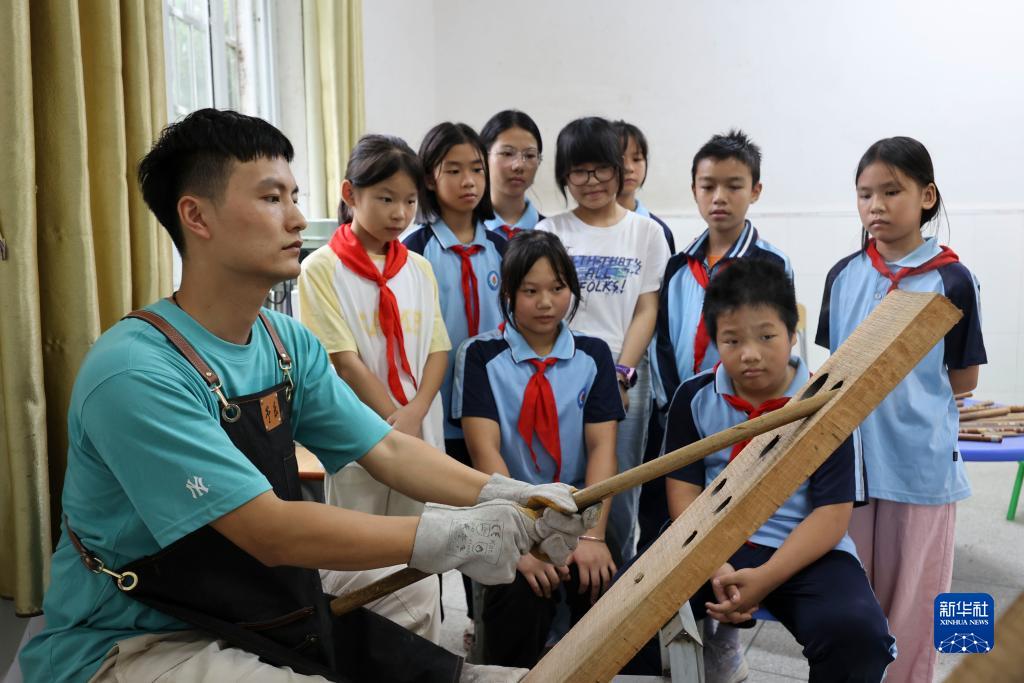 在江西省吉安市泰和縣水槎鄉中心小學(xué),肖惠文教孩子們制作竹笛(9月5日攝)。