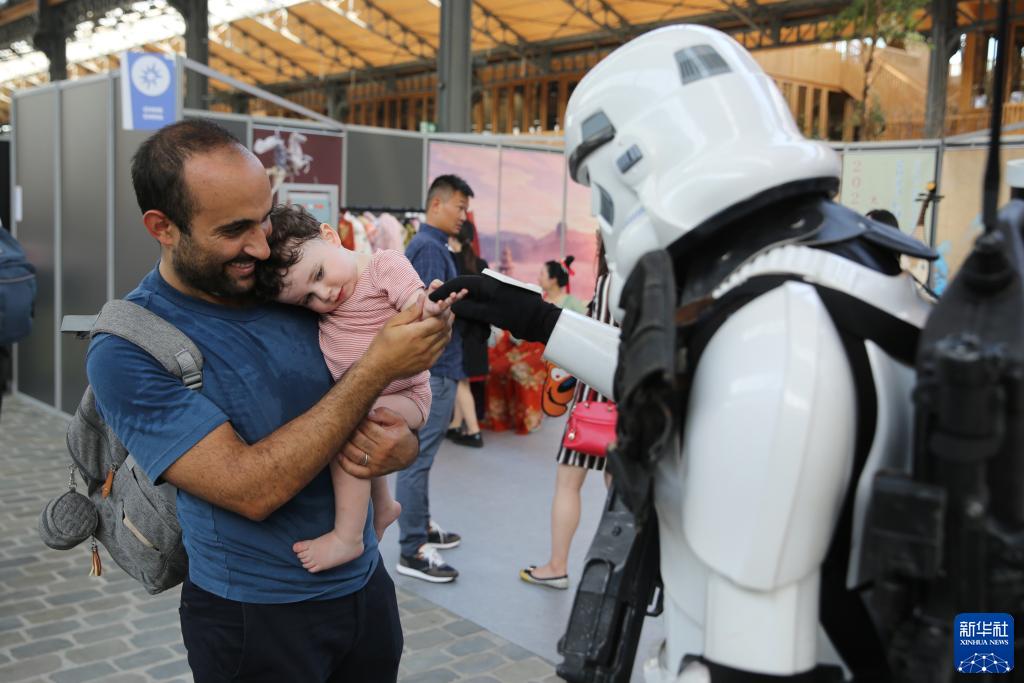 9月8日,在比利時(shí)布魯塞爾,扮成《星球大戰》系列作品人物形象的工作人員與小朋友互動(dòng)。