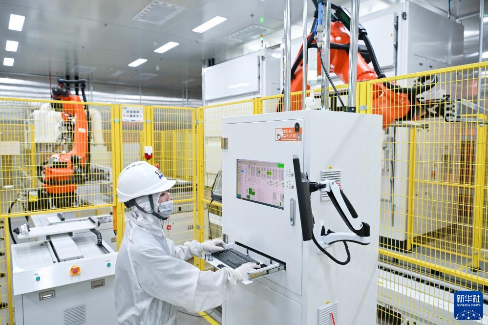 工作人員在蜂巢能源科技(鹽城)有限公司生產(chǎn)車(chē)間內操作智能生產(chǎn)設備(9月8日攝)。