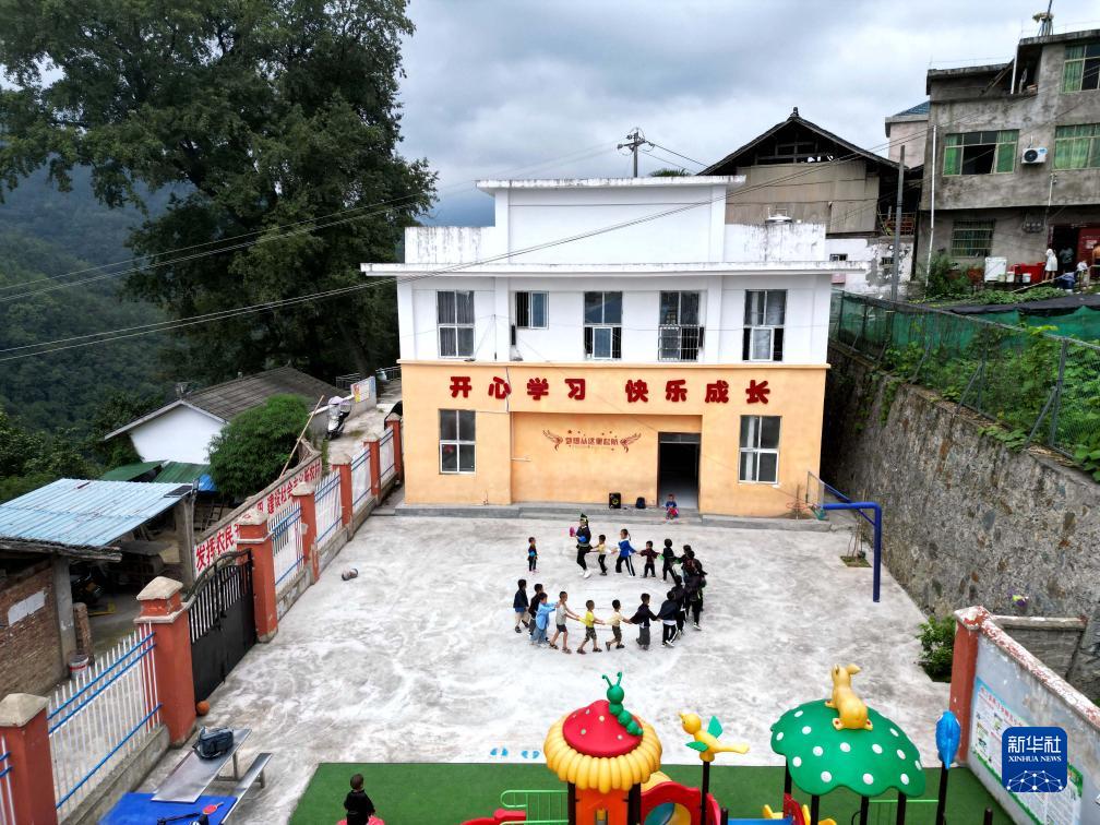 柳吉小學(xué)教師王章艷帶領(lǐng)學(xué)生在課間玩游戲(9月7日攝,無(wú)人機照片)。