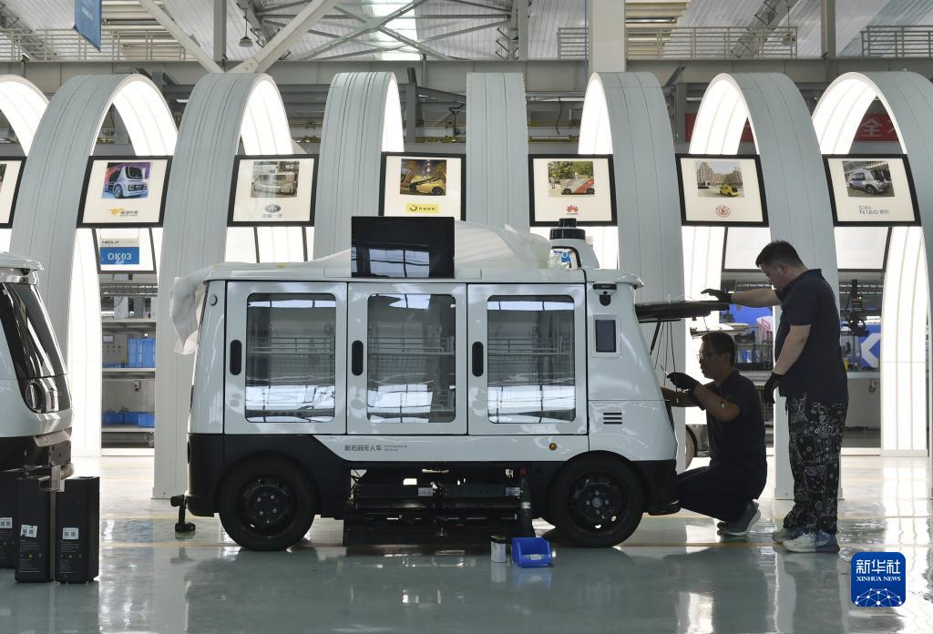 9月8日,河南省安陽(yáng)市安陽(yáng)縣一家無(wú)人車(chē)制造企業(yè)的工作人員在車(chē)間內作業(yè)。