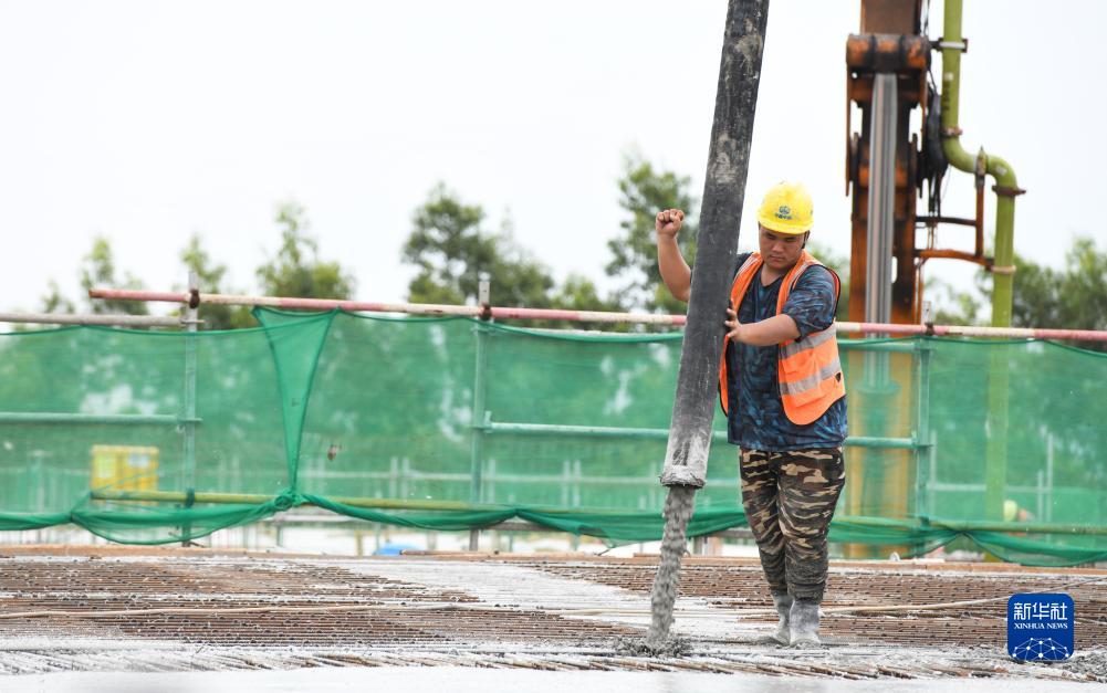 9月9日,工人在??谛潞8酆湍细邸岸€(xiàn)口岸”(貨運)集中查驗場(chǎng)所建設項目上施工作業(yè)。