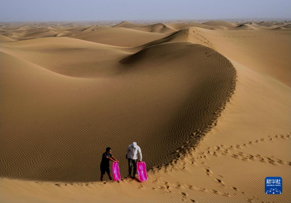 游客在新疆喀什地區麥蓋提縣N39°沙漠旅游景區內準備體驗滑沙(9月7日攝)。