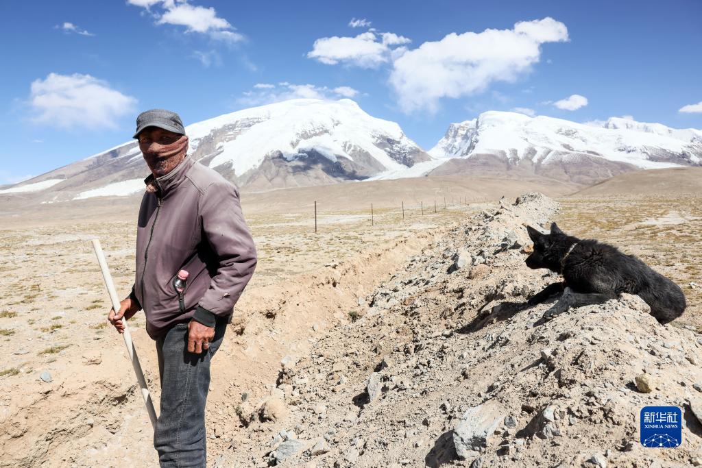 今年39歲的塔合曼鄉薩熱拉村牧民庫爾班艾里·買(mǎi)達賽因與牧羊犬“黑狼”一起遠遠地看著(zhù)羊群(9月6日攝)。
