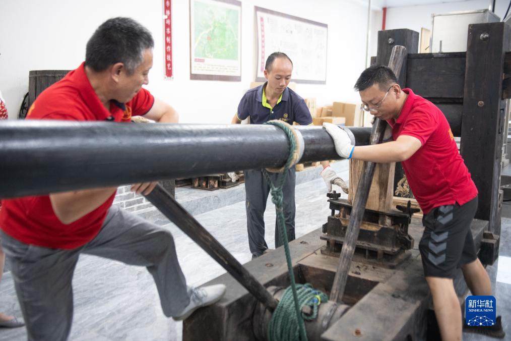 9月9日,工作人員在位于羊樓洞古鎮的趙李橋磚茶制作技藝傳承館展示古法壓茶。新華社發(fā)(杜子璇攝)