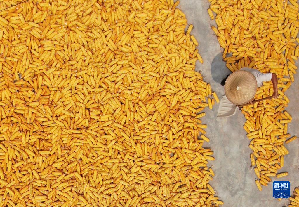 9月10日,在山東省臨沂市地方鎮黃城村,農民在晾曬收獲的玉米(無(wú)人機照片)。