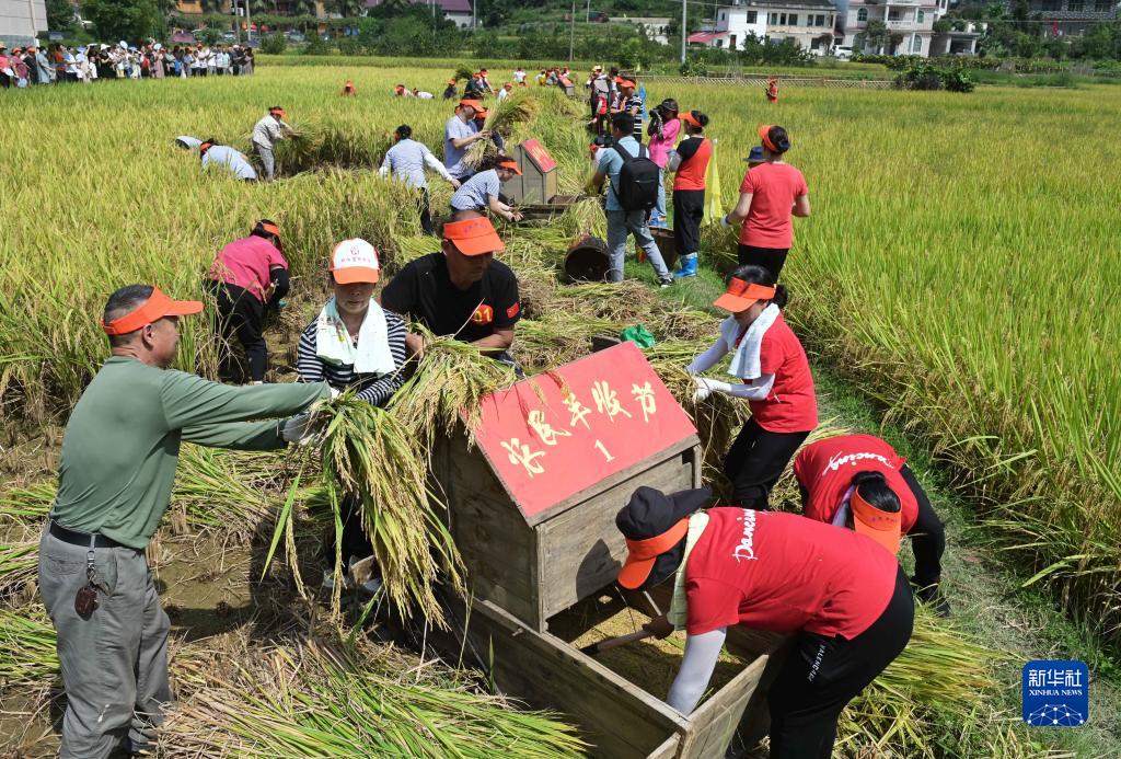9月9日,在湖南省邵陽(yáng)市洞口縣文昌街道平棟村一片成熟的中稻田地上,農民在進(jìn)行一場(chǎng)搶收稻谷比賽。