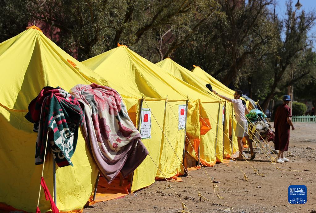 這是9月10日在摩洛哥震中附近的艾米茲米茲村一處臨時(shí)安置點(diǎn)拍攝的救災帳篷。