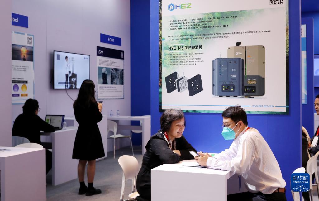 9月10日,一名制氫設備企業(yè)工作人員(右)在展臺上向參觀(guān)者介紹企業(yè)產(chǎn)品信息。