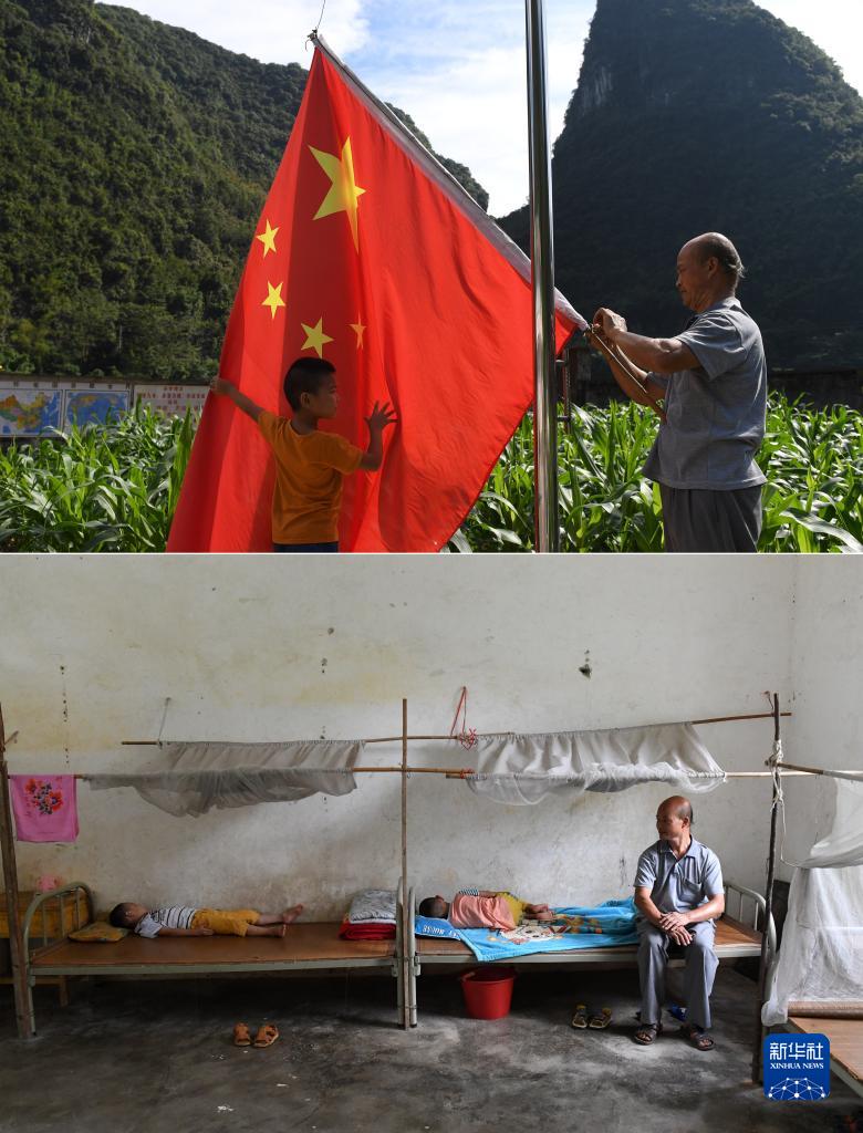 拼版照片:廣西都安瑤族自治縣龍灣鄉琴棋小學(xué)的黃若珍老師(右)和學(xué)生準備升國旗(上圖),黃若珍老師看護學(xué)生睡午覺(jué)(下圖)(2017年8月31日攝)。當時(shí),準備退休的黃若珍老師在這片大山講臺上已經(jīng)堅守整整40年,學(xué)校有學(xué)生寄宿,他每天除了給學(xué)生上課,還要給他們做飯,管他們的休息。