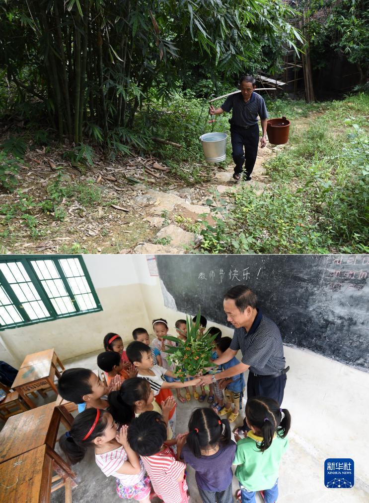拼版照片:廣西天等縣進(jìn)結鎮愛(ài)樂(lè )村龍坡屯龍坡教學(xué)點(diǎn)的黃明料老師到附近農家挑水回學(xué)校(上圖),黃明料老師接受學(xué)生教師節祝福(下圖)(2015年9月10日攝)。當時(shí),黃明料老師是這個(gè)教學(xué)點(diǎn)唯一的老師,工作日每天騎著(zhù)摩托車(chē)穿越10公里山路到教學(xué)點(diǎn)給孩子們上課。學(xué)校沒(méi)有自來(lái)水,日常用水都是他到附近村民家里挑來(lái)。