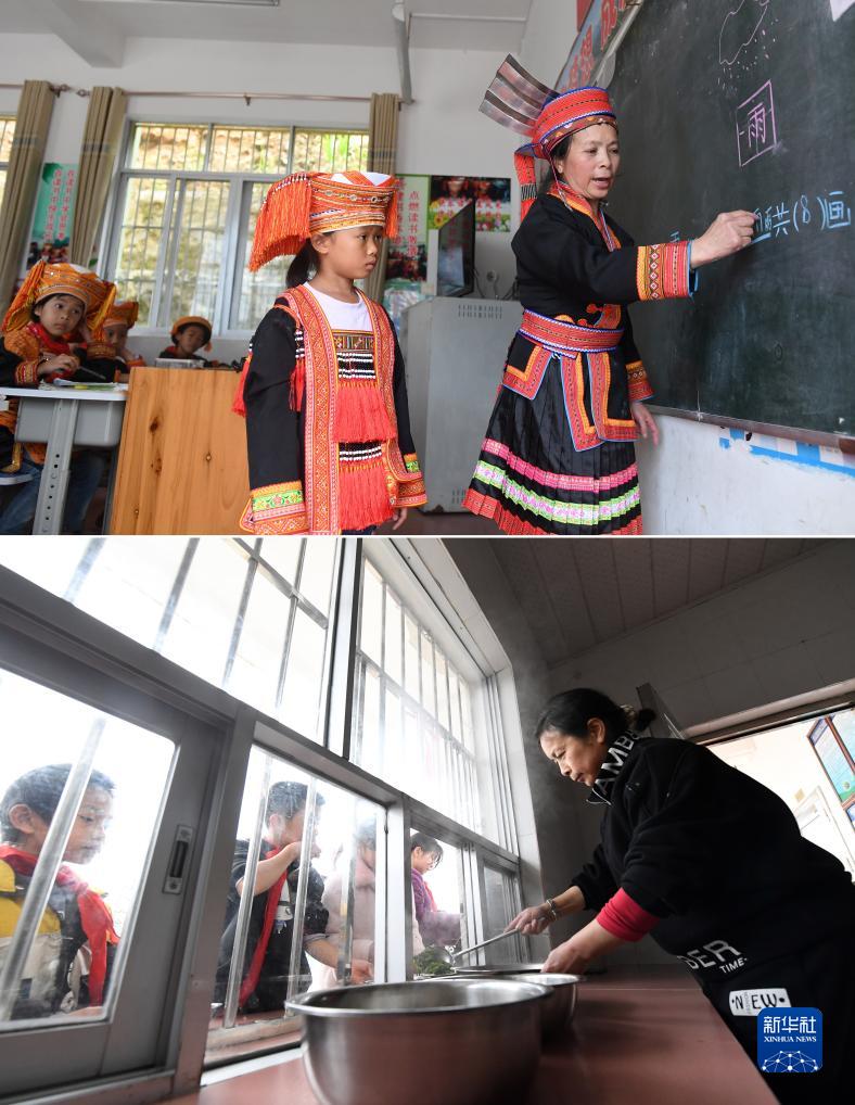 拼版照片:廣西金秀瑤族自治縣忠良鄉山界教學(xué)點(diǎn)的陶鳳英老師指導學(xué)生做課堂作業(yè)(上圖,2019年6月4日攝),陶鳳英老師給學(xué)生分菜準備吃午飯(下圖,2023年3月15日攝)。陶鳳英是廣西金秀瑤族自治縣忠良鄉山界教學(xué)點(diǎn)的老師,在近40年教書(shū)生涯里,她先后在9所大山教學(xué)點(diǎn)工作過(guò),除了給學(xué)生上課,還要給他們做營(yíng)養午餐。陶鳳英2019年入選“中國好人榜”。
